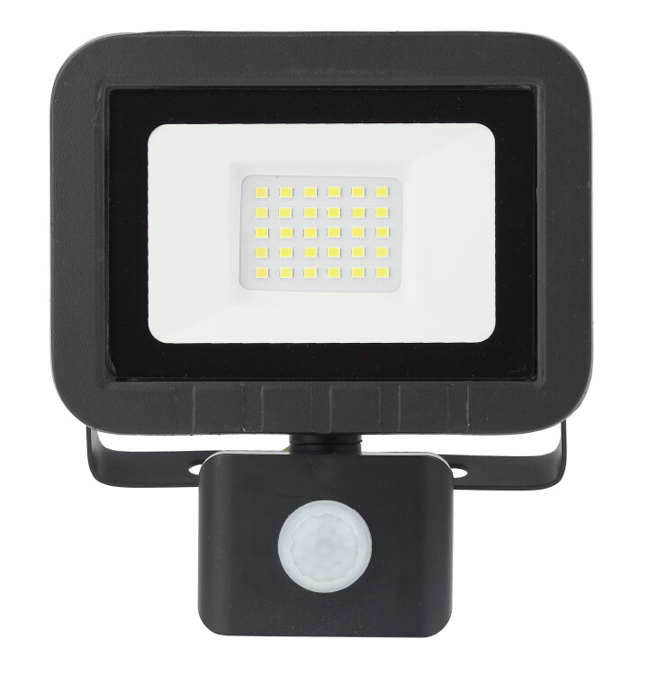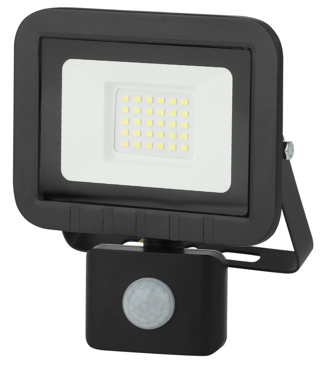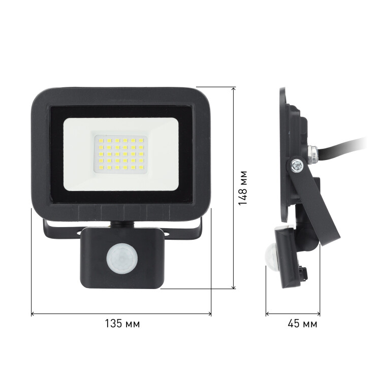 Прожектор светодиодный уличный с выносным регулируемым датчиком движения (СДО) ЭРА LPR-041-2-65K-030 мощность 30 Вт, с цветовой температурой 6500К (холодный белый свет), пылевлагозащитой IP65 (защищен от пыли и струй воды с любого направления), световым потоком 2400 Лм. Инфракрасный датчик реагирует на движение в зоне действия (радиус срабатывания от 1 до 8м) и автоматически включает освещение (время задержки от 5сек до 8мин). Корпус изготовлен из анодированного алюминия с покраской в черный цвет. Стекло - закаленное. LED технология обеспечивает длительный срок службы и экономию электроэнергии. Светильник работает в широком диапазоне рабочих напряжений - 200-240В, а также широком диапазоне температу от -45 до +40 - подходит как для внутреннего, так и наружного применения. Предназначен как для промышленного, так и для бытового освещения: дворов, подсобных помещений, приусадебных хозяйств, билбородов, в качестве уличного фонаря.