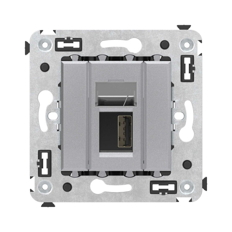 USB 2.0 ро зетка. Назначение: для монтажа в подрозеточные коробки глубиной не менее 45 мм (код 59301). Используется в качестве информационной розетки для передачи сигнала (подключение проекторов, мониторов и др.). Цвет: "Закаленная сталь".Производитель оставляет за собой право вносить во внешний вид изделия изменения, которые не влияют на его функционал, безопасность и надежность.