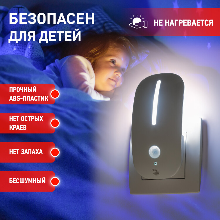 Светильник-ночник со светодиодами (LED) в качестве источников света. Удобная и функциональная модель с сенсором света и датчиком движения (включается автоматически от движения в зоне действия датчика движения, только когда темно. Светодиодный ночник не мерцает, что помогает сохранить здоровье глаз. Минимальное потребление энергии позволяет использовать прибор всю ночь.
