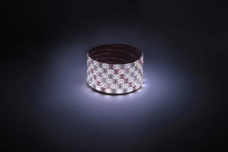 В составе комплекта: LED лента на двустороннем скотче, источник питания, коннекторы. Рабочее напряжение ленты составляет 12В, а мощность равна 4,8 Вт/м. Светодиодная лента обладает световым потоком 280 Лм/м, и цветом свечения - холодный белый (6500 K)