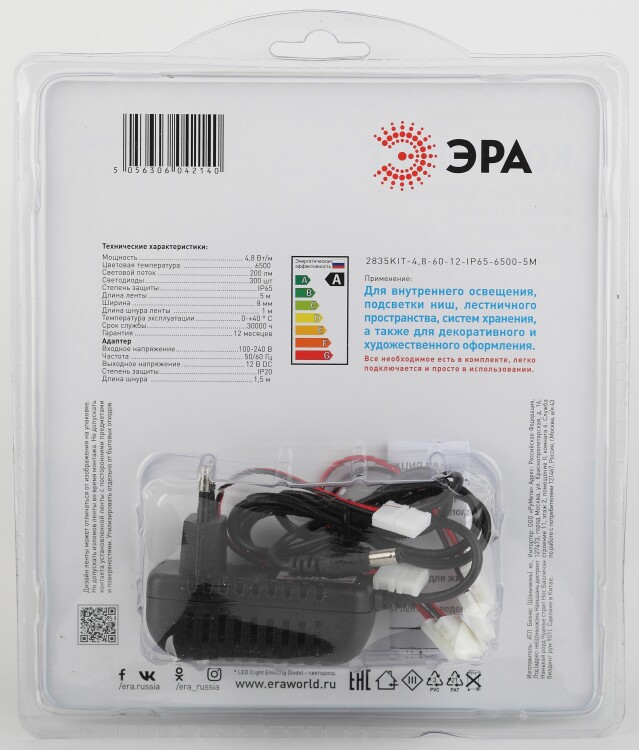 ЭРА Комплект светодиодной ленты 2835kit-4,8-60-12-IP65-6500-5m (50/600) со степенью защиты от пыли и влаги IP65 - современный способ создания внутреннего освещения, подсветки ниш, лестничного пространства, систем хранения, а также декоративного и художественного оформления любых объектов и форм в помещениях с повышенным уровнем влажности и уличного освещения.