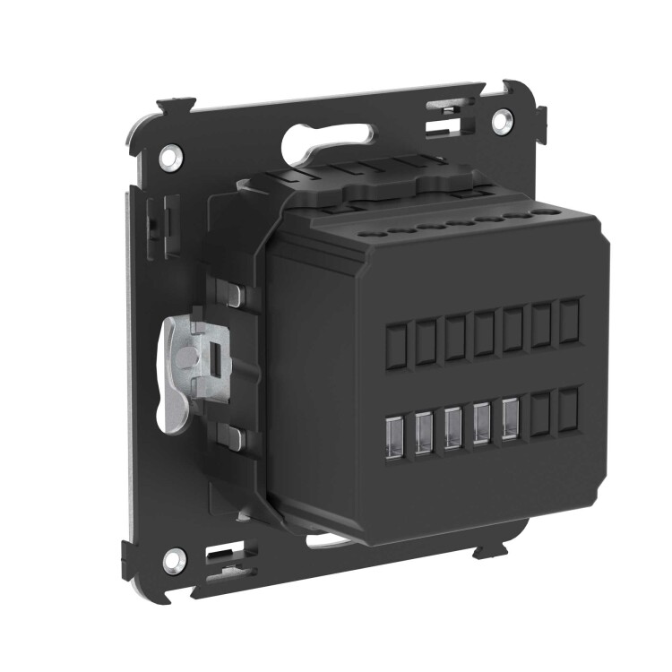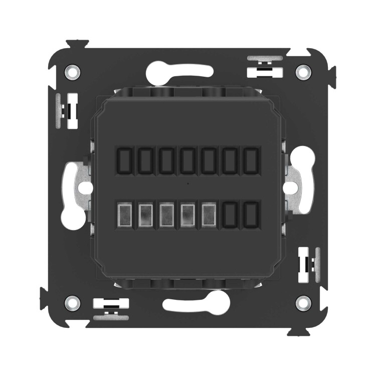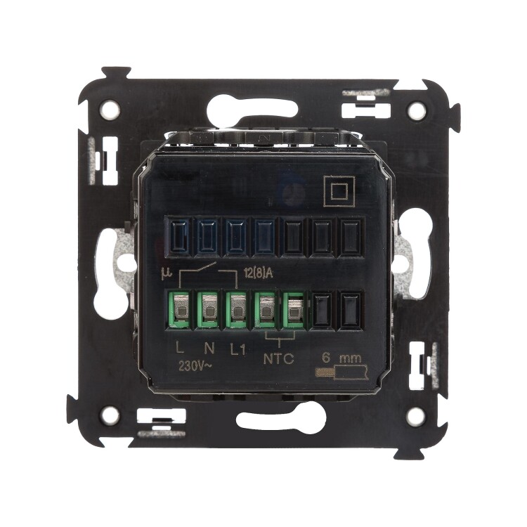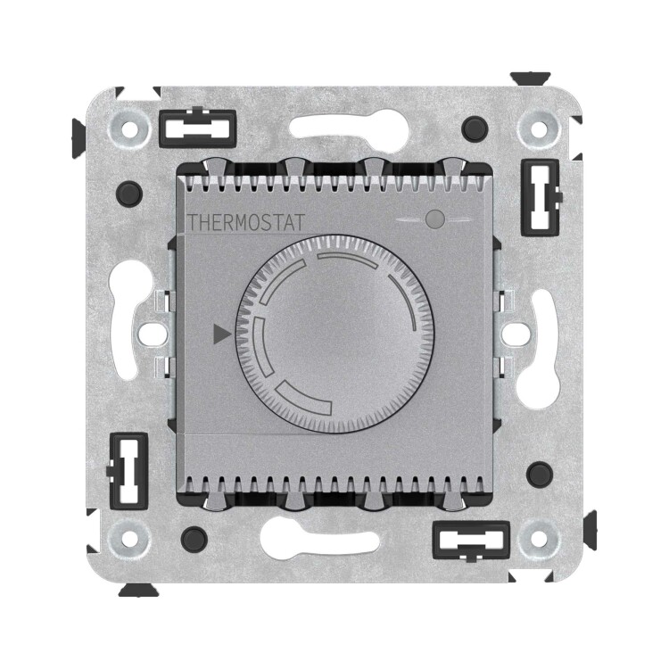 Термостат для теплых полов. Назначение: для монтажа в подрозеточные коробки глубиной не менее 45 мм (код 59301);. Предназначен для управления теплыми полами. Характеристики: диапазон от 5 до 30 °С; частота – 50–60 Гц; номинальное напряжение – 230 В; лампа-индикатор включается, когда температура в комнате падает ниже выбранного значения; нагрузка: 12 A – cosφ=1; 4,8 A – cosφ=0,4; фиксация в подрозеточные коробки глубиной не менее 45 мм при помощи каркаса с лапками (код 4400802) и саморезов; провод датчика температуры в комплекте (длина 3,5 метра). Цвет: "Закаленная сталь".