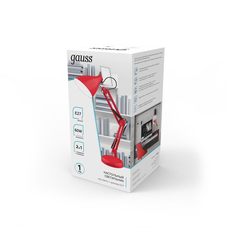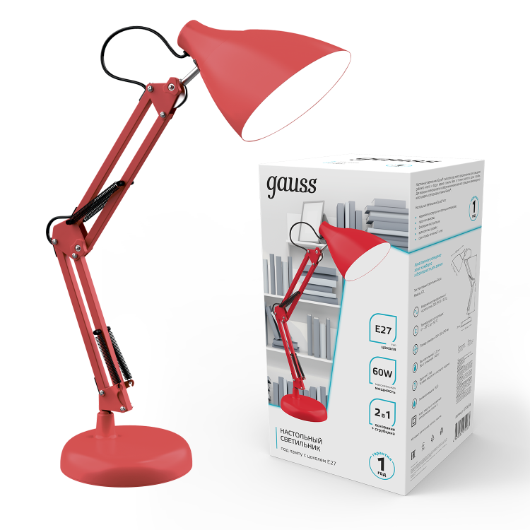 Светильник настольный Gauss модель GTL003 60W 220-240V E27 красный струбцина и основание 1/12
