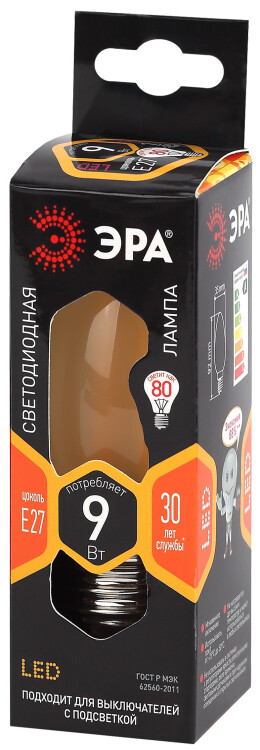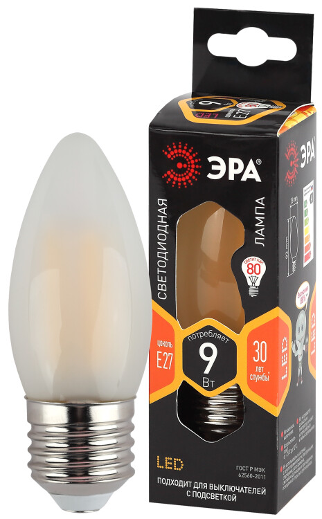 Лампы СВЕТОДИОДНЫЕ F-LED B35-9w-827-E27 frost ЭРА (филамент, свеча мат, 9Вт, тепл, E27) (кр.1шт)