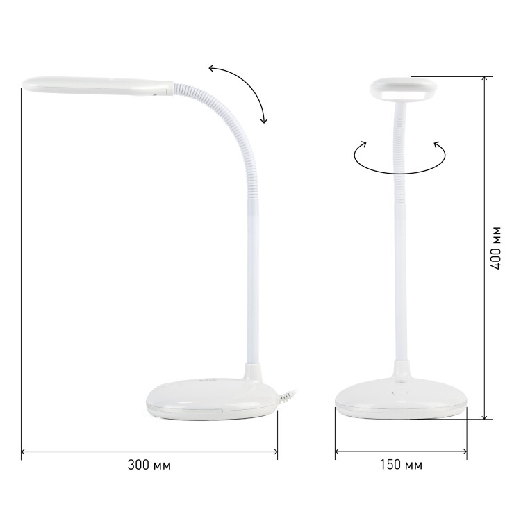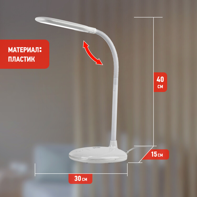 Настольный светильник ЭРА NLED-477-8W-W со светодиодами (LED) в качестве источников света. У светильника выключатель на основании. Это базовая модель с оптимальным универсальным дизайном хорошей для работы за столом высоты (40 см). Гибкая стойка позволяет выбирать наиболее комфортное направление света.