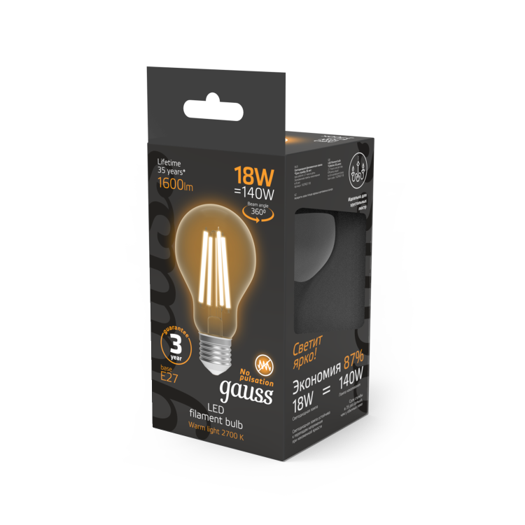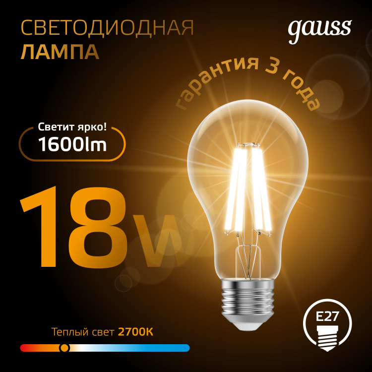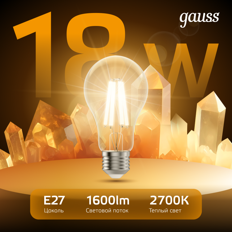Лампа Gauss Filament А60 18W 1600lm 2700К Е27 LED 1/10/40