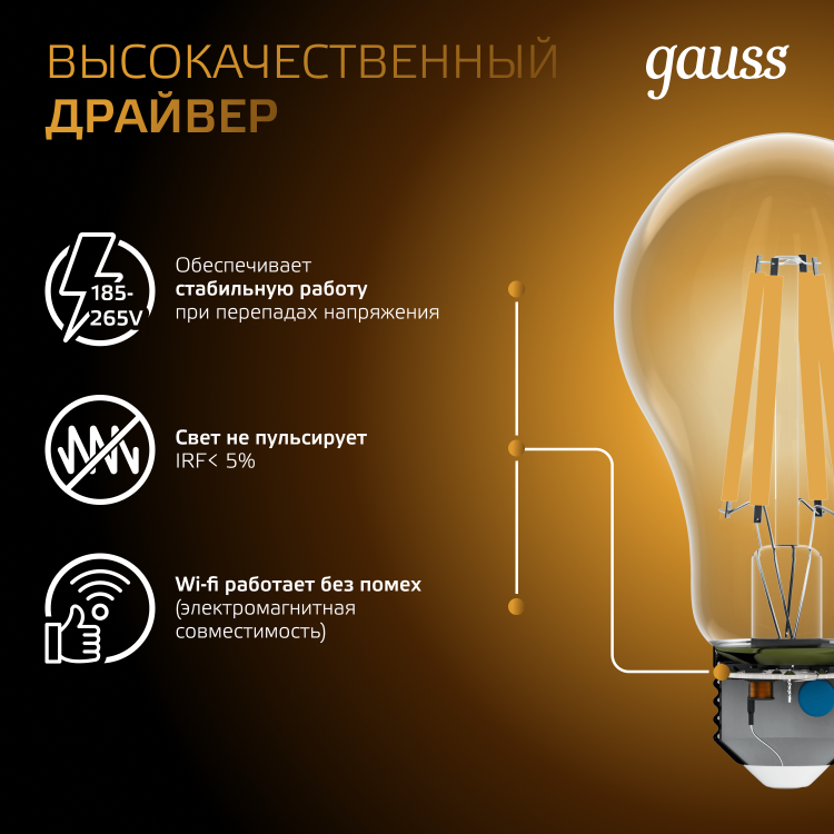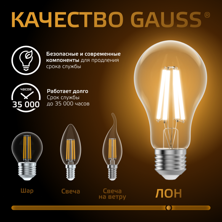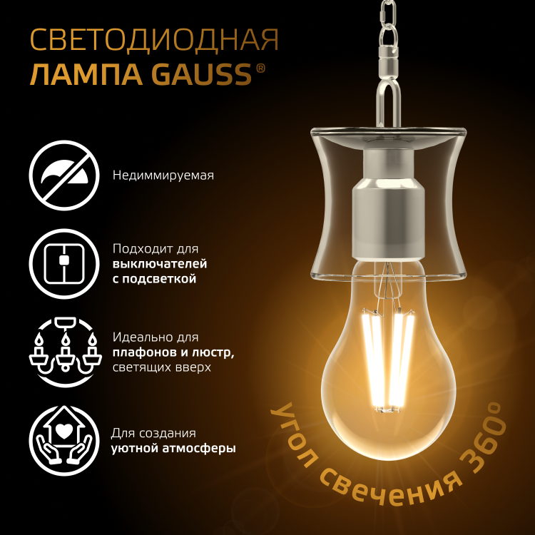 Светодиодные филаментные лампы GAUSS - это новейшие технологии в светотехнике. Лампы имеют привычный вид классических ламп накаливания, освещают пространство на 360о и дают больше света по сравнению с обычными светодиодными лампами за счет прозрачной колбы. Идеально подходят для хрустальных люстр и открытых светильников, а также для реализации дизайнерских решений, где важен вид классических ламп накаливания.