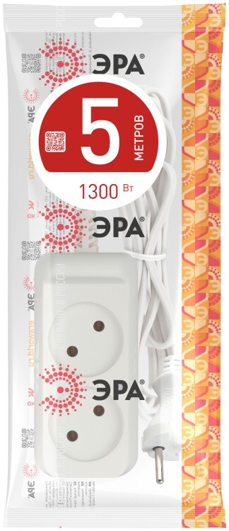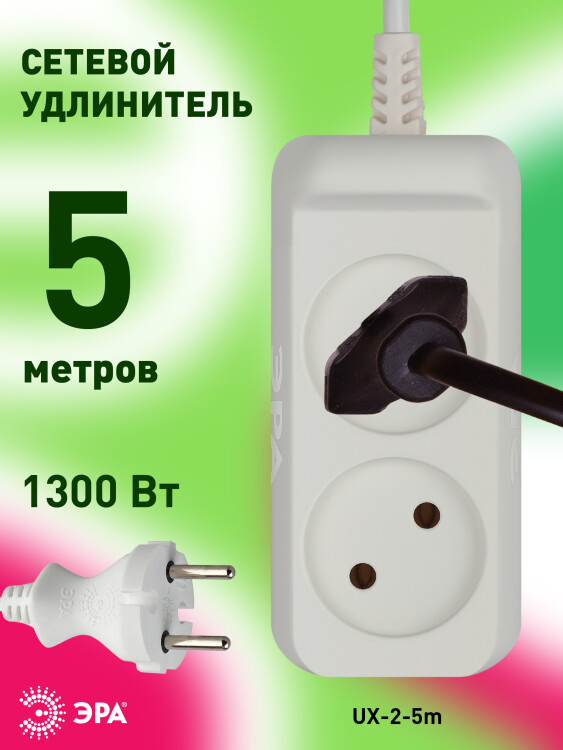 Компактный бытовой удлинитель ЭРА UX-2-5m на 2 р озетки, без заземления. Рассчитан на одновременное подключение к розетке до двух маломощных электроприборов, максимальная нагрузка - 6 A/ 1300 Вт. Длина шнура - 5 метров. Надёжный двухжильный провод ШВВП. Корпус изготовлен из прочного негорючего полипропилена с защищающими от возгорания антипиренами. Закруглённые углы, брендирование на вилке и корпусе, базовый белый цвет- этот удлинитель отличается аккуратным приятным дизайном.