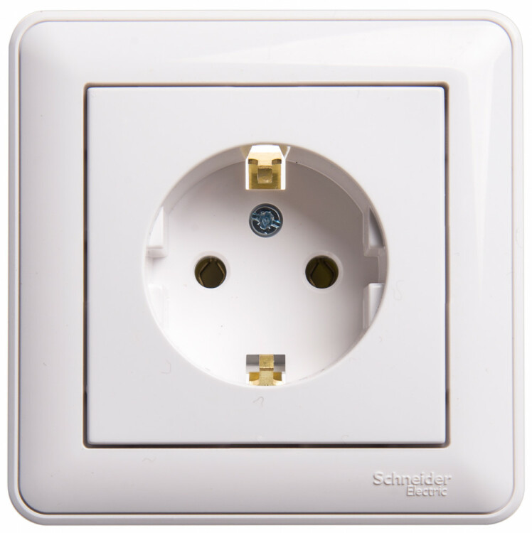Розетка Systeme Electric (ранее Schneider Electric) W59 (в сборе, цвет белый) с заземлением без шторок подходит для сетей 250 В, на ток 16 А.