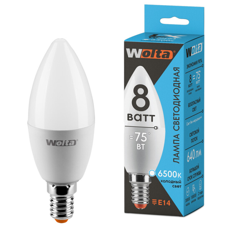 Светодиодная лампа WOLTA LX 30WC8E14 "Свеча" C37 8Вт 640лм 6500К Е14 1/50 (кр.50шт)