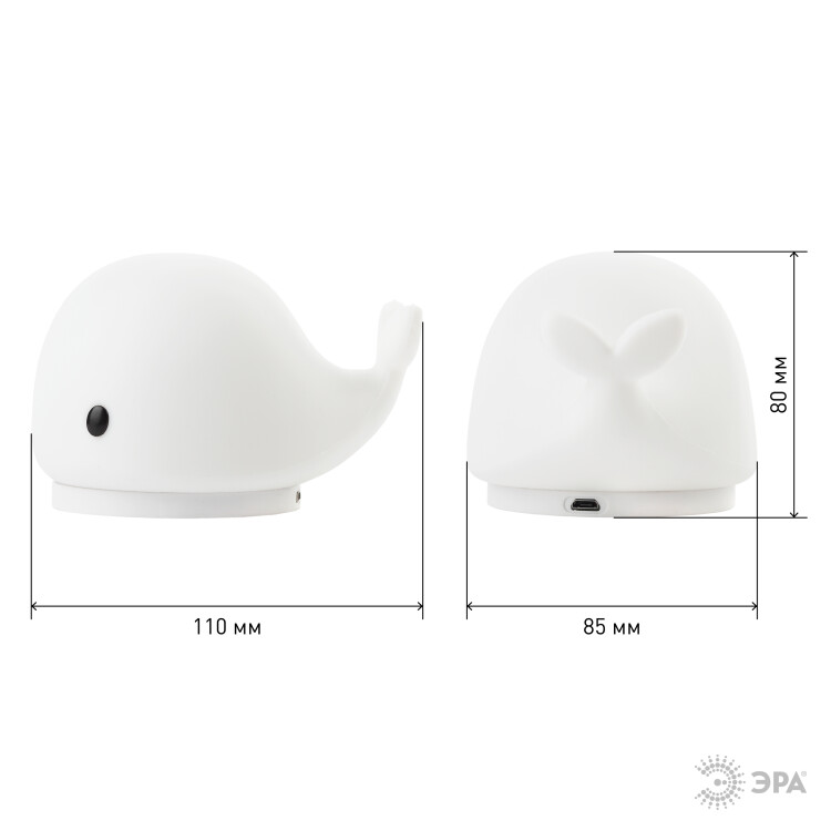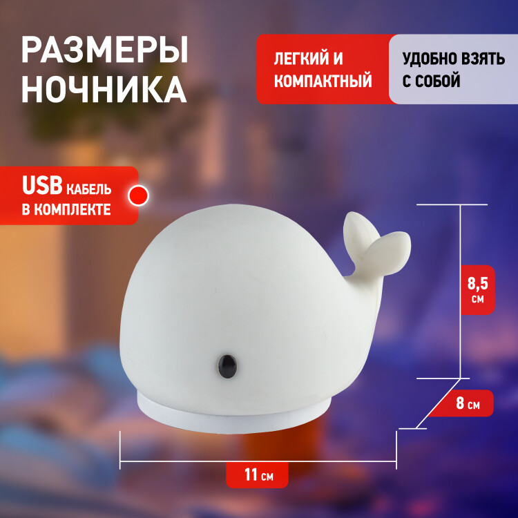 Очаровательный детский светильник-ночник ЭРА NLED-411-1W-W в виде аккуратной фигурки Кита. Он поможет интересно обставить детскую комнату, легко успокоит непоседу и создаст комфорт в спальне. У силиконового светодиодного ночника 2 режима: постоянный белый свет и RGB c переходами цветов. Один прогонит монстра в шкафу или под кроватью, другой настроит малыша на яркие беззаботные сны. Освещение переключается с помощью прикосновения - и делать это очень комфортно благодаря приятной на ощупь поверхности. Кстати, Ваш ребенок может гладить игрушку: она поможет снять напряжение. Отключите сенсор, если хотите оставить нужный режим. Лампа-ночник работает на батарейках, потому ее удобно перенести с собой в спальню или поставить для новорожденного на кроватку. В комплект также входит USB-шнур: подключите Кита к сети, если сядут батарейки (не входят в комплект) или если розетка Вам удобнее, и просто переключите Кита выключателем в режим USB. Такой сюрприз порадует не только малыша, но и взрослого. Впустите это чудо-юдо к себе в дом.