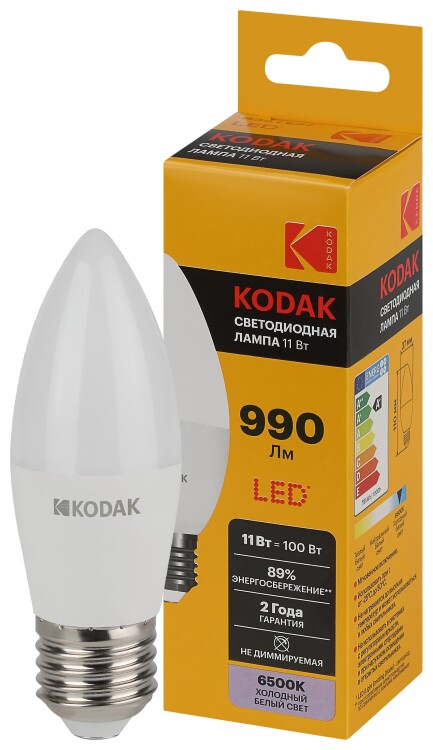 Представляем Вашему вниманию новинку от легендарного бренда Kodak - светодиодные лампочки, которые украсят Ваш интерьер и наполнят дом светом. Лампы всемирно известной марки отличаются традиционно высоким качеством, продолжительным сроком службы, эксплуатационной надежностью, и, конечно, доступной ценой. LED KODAK B35-11W-865-E27 - лампочка с цоколем E27, отлично подойдет для самых разных целей: ее можно установить в люстру или светильник на кухне, в спальне, детской комнате или коридоре. Мощность лампы составляет 11Вт, эквивалент лампе накаливания - 100Вт. Цветовая температура - 6500К - ярчайший белый свет, слегка уходящий в голубой спектр. Такой свет идеально подойдет для помещений, где требуется высокая концентрация и продуктивный настрой. Диаметр лампочки составляет 37мм, а высота - 110мм. Корпус устройств выполнен из высококачественных алюминия и термо пластика, что делает использование источников света абсолютно безопасным. Невозможно оставить без внимания неоспоримые преимущества технологии, в которой выполнены лампы: LED (светодиоды KODAK). В первую очередь, это высокая светоотдача и низкое энергопотребление: эти источники света тратят в 10 раз меньше, чем лампы накаливания. Срок службы - 35000 часов - более чем 3,5 года постоянного свечения. Еще одно преимущество - светодиоды не содержат в себе ртути и прочих вредных металлов. Купив лампу от Kodak, Вы сможете быть уверены в высоком качестве продукта и безопасности своих близких.
