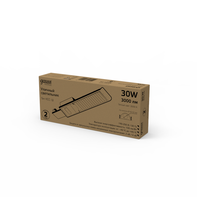 Светильник уличный Gauss LED Avenue G2 с распределением КСС по типу "Ш" (широкая кривая) предназначен для освещения участков дорог, подъездных территорий, дворов, стоянок, приусадебных участков. У него высокий уровень пылевлагозащиты IP 65 и защиты от импульсных помех, таких как перепады напряжения, гроза, включение и выключение мощных нагрузок. Тип крепления - консо льный, корпус выполнен из анодированного алюминия исключающего коррозию и механические повреждения.
