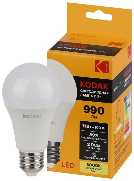 Представляем Вашему вниманию новинку от легендарного бренда Kodak - светодиодные лампочки, которые украсят Ваш интерьер и наполнят дом светом. Лампы всемирно известной марки отличаются традиционно высоким качеством, продолжительным сроком службы, эксплуатационной надежностью, и, конечно, доступной ценой. LED KODAK A60-11W-830-E27 - лампочка с цоколем E27, отлично подойдет для самых разных целей: ее можно установить в люстру или светильник на кухне, в спальне, детской комнате или коридоре. Мощность лампы составляет 11Вт, эквивалент лампе накаливания - 100Вт. Цветовая температура - 3000К - теплый свет, подобный к свечению ламп накаливания. Такой свет идеально подойдет для спальни или детской комнаты, благодаря теплому свету помещение наполнится атмосферой тепла и уюта. Диаметр лампочки составляет 60мм, а высота - 110мм. Корпус устройств выполнен из высококачественных алюминия и термо пластика, что делает использование источников света абсолютно безопасным. Невозможно оставить без внимания неоспоримые преимущества технологии, в которой выполнены лампы: LED (светодиоды KODAK). В первую очередь, это высокая светоотдача и низкое энергопотребление: эти источники света тратят в 10 раз меньше, чем лампы накаливания. Срок службы - 35000 часов - более чем 3,5 года постоянного свечения. Еще одно преимущество - светодиоды не содержат в себе ртути и прочих вредных металлов. Купив лампу от Kodak, Вы сможете быть уверены в высоком качестве продукта и безопасности своих близких.