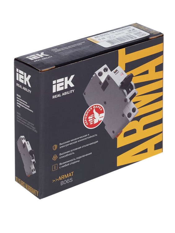 Автоматические выключатели д ифференциального тока (АВДТ) ARMAT серии B06S могут осуществляют функции защиты от токов перегрузки и короткого замыкания и защиты человека от токов замыкания на землю. Модельный ряд включает в себя устройства с номинальными токами от 6 до 32 А, характеристиками срабатывания по сверхтоку B и C, типами защит AC и A с номинальным дифференциальным током отключения 30 мА. Номинальная отключающая способность АВДТ ARMAT серии B06S составляет 6 кА.