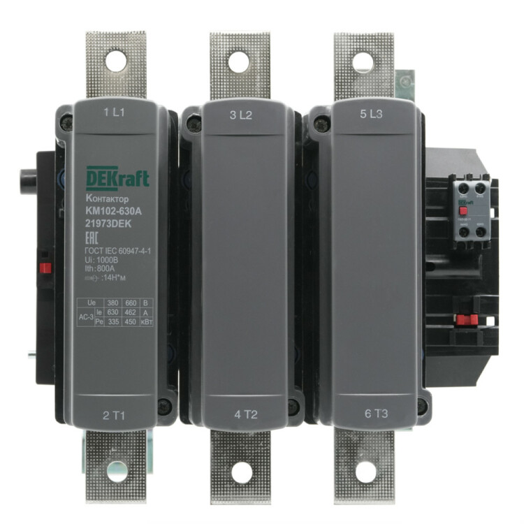 Контактор серии КМ-102 Dekraft; 3P; номинальный ток - 630 А (AC3, AC4); напряжение управления 230 В пер.тока; доп.контакты 1НО+1НЗ; установка на монтажную плату. Контакторы КМ-102 предназначены для пуска и останова асинхронных двигателей, для коммутации осветительных сетей, в сетях напряжением до 690 В пер.тока. Дополнительные защитные крышки исключают попадание пыли внутрь контактора и обеспечивают защиту от случайного прикосновения.