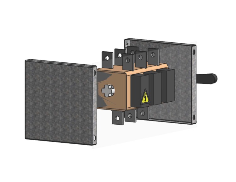 Экран кожух рубильника выполнен их прозрачного органического стекла, что позволяет визуально оценивать состояние контактов рубильника, а так же предназначен для защиты от прикосновения к токоведущим частям