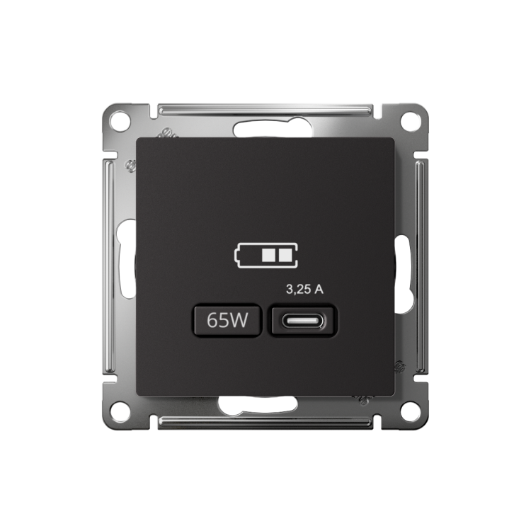 Розетка Systeme Electric (ранее Schneider Electric) серии AtlasDesign в цвете карбон USB с разъемом типа C высокоскоростная. С амая современная USB-зарядка позволяет заряжать ноутбук, а также смартфоны последнего поколения, которые поддерживают функцию быстрой зарядки. Мощность: тип-С - 65Вт. Поддерживает современные протоколы быстрой зарядки QC, PD, последних версий. Лицевые детали из качественного ABS-пластика, устойчивого к царапинам и УФ-излучению. Благодаря покрытию «soft touch» к изделию приятно прикасаться.