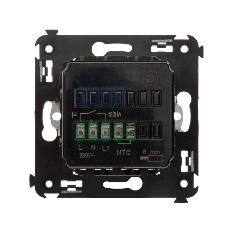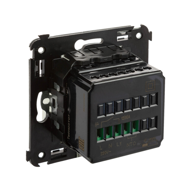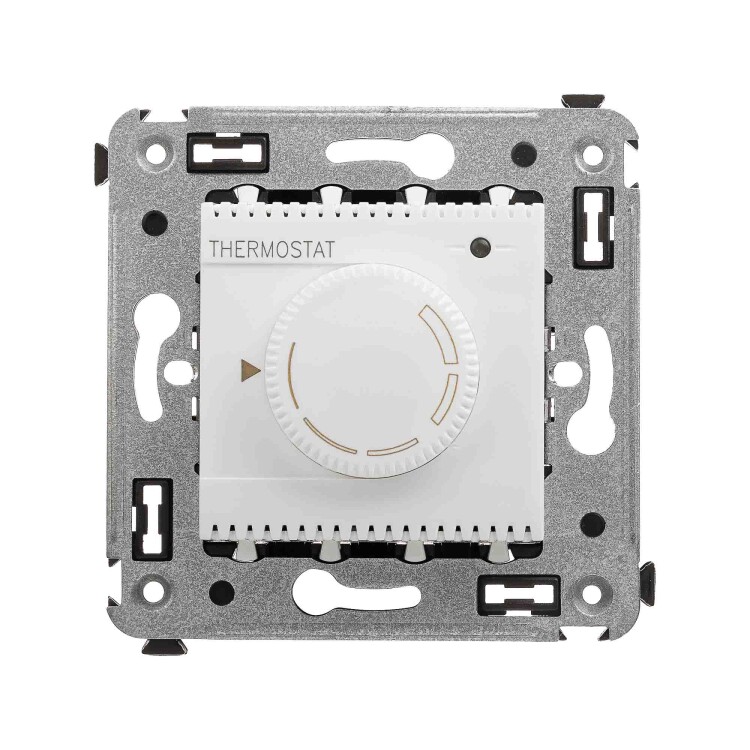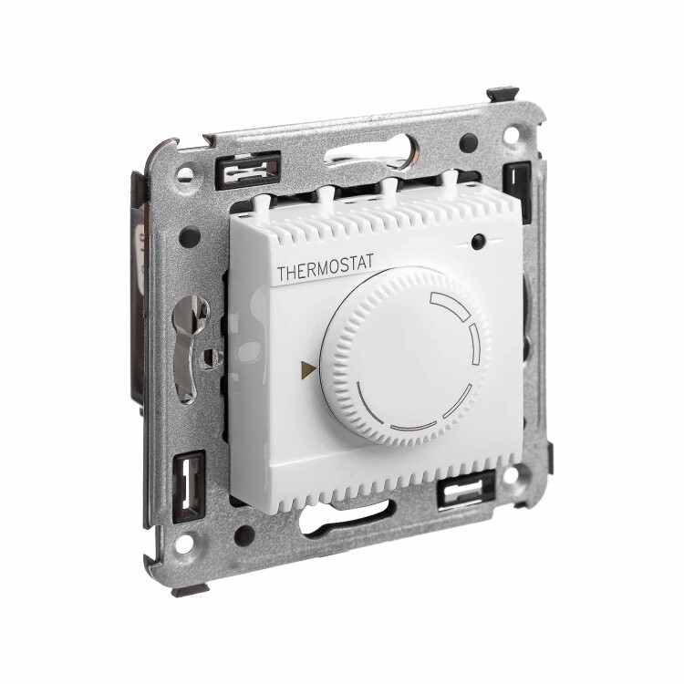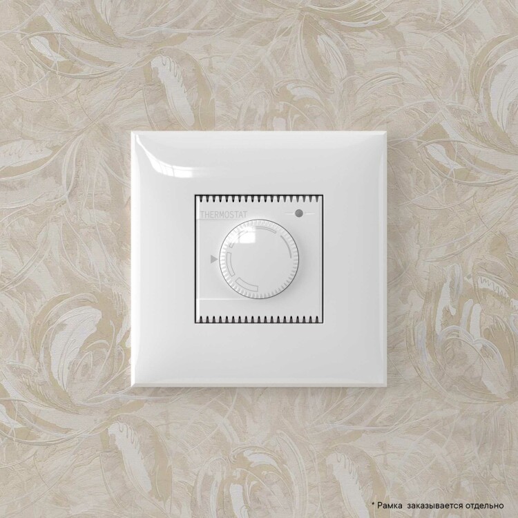 Термостат для теплых полов. Назначение: для монтажа в подрозеточные коробки глубиной не менее 45 мм (код 59301);. Предназначен для управления теплыми полами. Характеристики: диапазон от 5 до 30 °С; частота – 50–60 Гц; номинальное напряжение – 230 В; лампа-индикатор включается, когда температура в комнате падает ниже выбранного значения; нагрузка: 12 A – cosφ=1; 4,8 A – cosφ=0,4; фиксация в подрозеточные коробки глубиной не менее 45 мм при помощи каркаса с лапками (код 4400802) и саморезов; провод датчика температуры в комплекте (длина 3,5 метра). Цвет: "Белое облако".