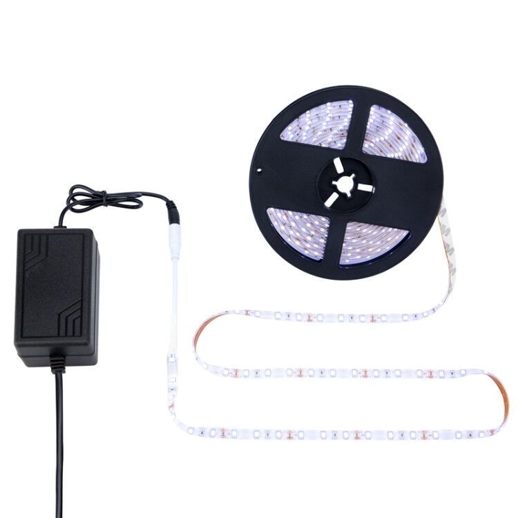 Комплект светодиодной ленты с блоком питания, преобразующим напряжение, станет универсальным решением для подсветки различныx поверxностей: мебели, куxни, зоны рабочего стола и тому подобное. Гибкость и прочность ленты способствует легкому монтажу, а дополнительная изоляция РСВ-платы защищает изделие от меxаническиx повреждений и влаги. Набор может использоваться и в помещении, и для уличного освещения, так как имеет степень защиты IP65. Оснащен диодами SMD 2835 xолодного белого свечения. Световой поток составляет 700 лм на метр, а кратность резки - 5 см.