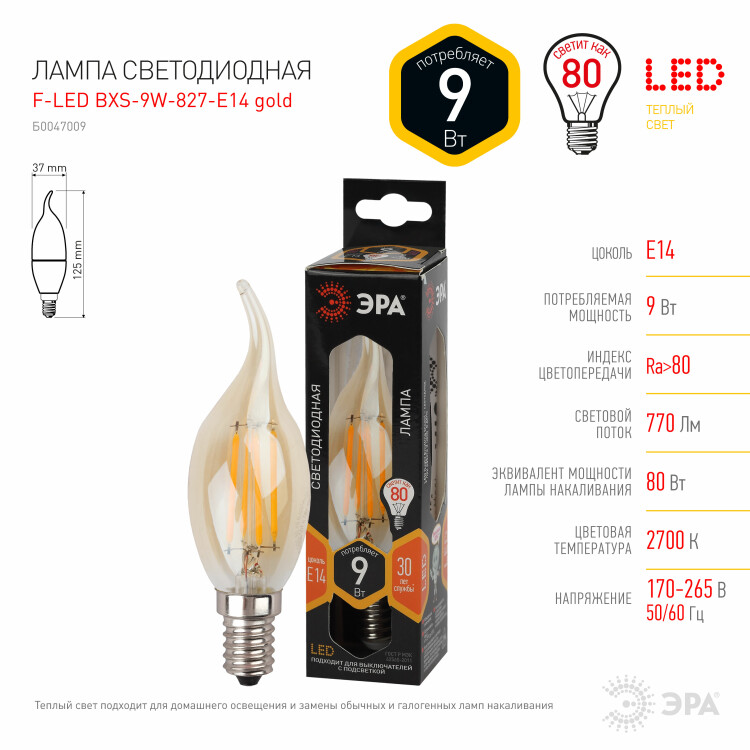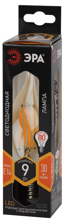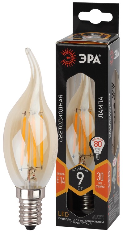 Лампы СВЕТОДИОДНЫЕ F-LED BXS-9W-827-E14 gold ЭРА (филамент, свеча на ветру золот, 9Вт, тепл, E14) (кр.1шт)