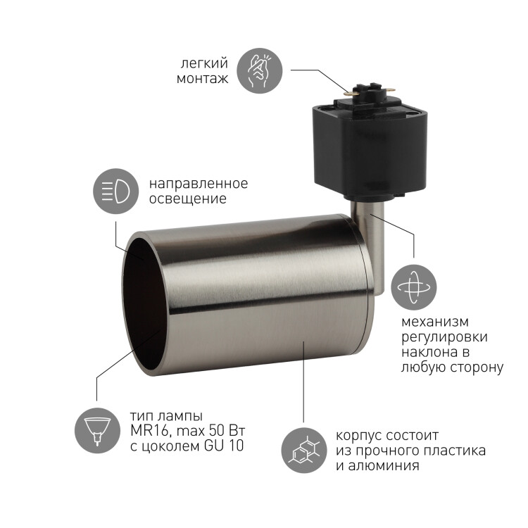Трековый светильник TR14-GU10 SN отличается стильным дизайном. Он достойно дополнит любой, даже самый изысканный интерьер. Он имеет поворотную часть, благодаря чему можно менять направление светового потока в любую сторону. Источником света является лампа с цоколем GU10, которая делает светильник максимально универсальным и дает возможность выбрать необходимую мощность, цветовую температуру и угол рассеивания. Светильник наилучшим образом подойдет для создания зонированного пространства. Направленный свет позволит выделить конкретный предмет или целый стеллаж. Трековые светильники легко монтируются, подстраиваются под дизайнерские особенности помещения, позволяют, при необходимости, полностью менять восприятие пространства.