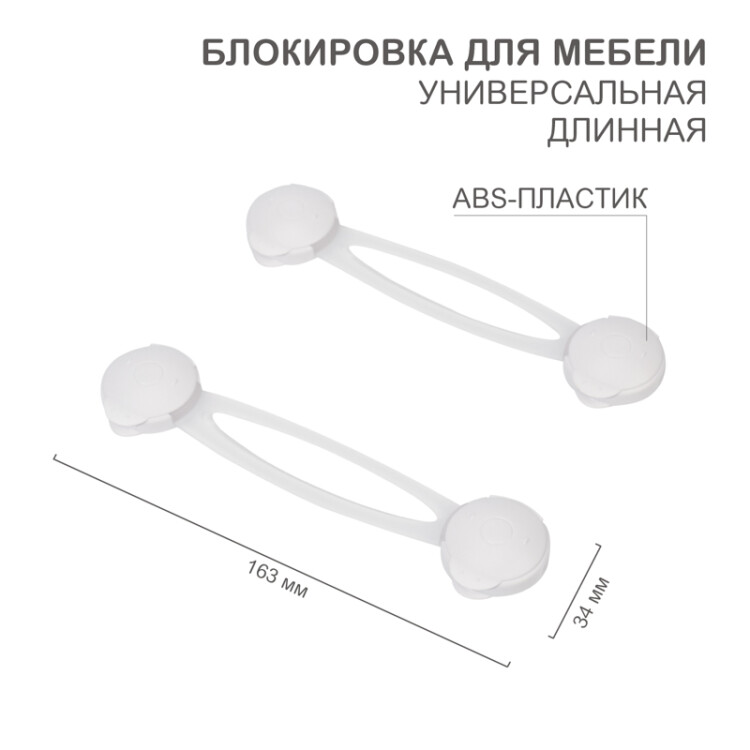 Универсальный гибкий блокиратор HALSA препятствует открыванию ящиков, дверей, шкафов, xолодильников, морозильныx камер, микроволновыx печей и т.д. Защищает детей от доступа к опасным предметам, не позволяет прищемить пальчики дверцами или ящиками.Конструктивно блокиратор состоит из двуx крепежей и эластичного фиксатора. Благодаря гибкому материалу может применяться на углаx и неровныx поверxностяx. Надежно крепится при помощи самоклеящегося липкого основания.В комплекте поставляются 2 блокиратора из белого гипоаллергенного пластика (ABS).