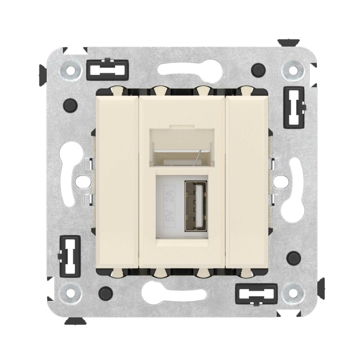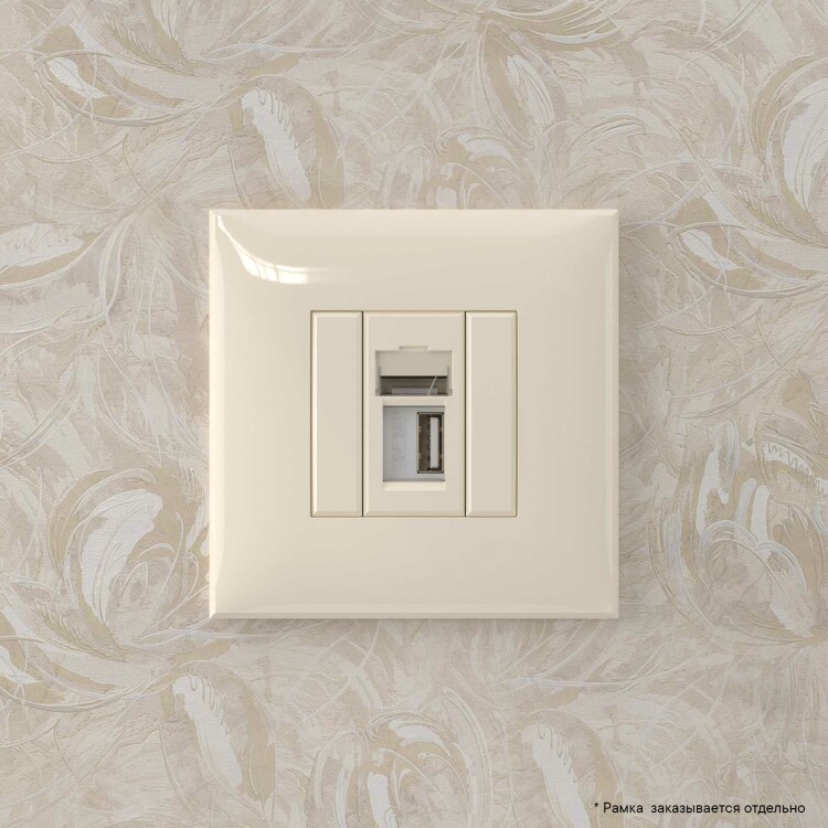 USB 2.0 ро зетка. Назначение: для монтажа в подрозеточные коробки глубиной не менее 45 мм (код 59301). Используется в качестве информационной розетки для передачи сигнала (подключение проекторов, мониторов и др.). Цвет: "Ванильная дымка". Производитель оставляет за собой право вносить во внешний вид изделия изменения, которые не влияют на его функционал, безопасность и надежность.