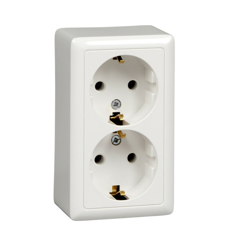 Розетка Systeme Electric (ранее Schneider Electric) ХИТ (открытой установки, цвет белый) двойная с заземлением, без шторок с изолирующей пластиковой пластиной предназначена для сетей до 250 В на ток до 16 А. Двойная розетка позволяет подключить два устройства в одном месте. Заземляющий контакт обеспечивает дополнительную защиту от удара электрическим током. При наличии заземления электрический по тенциал уходит в землю, защищая человека. Сделано в России.