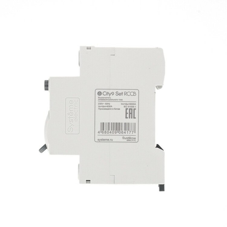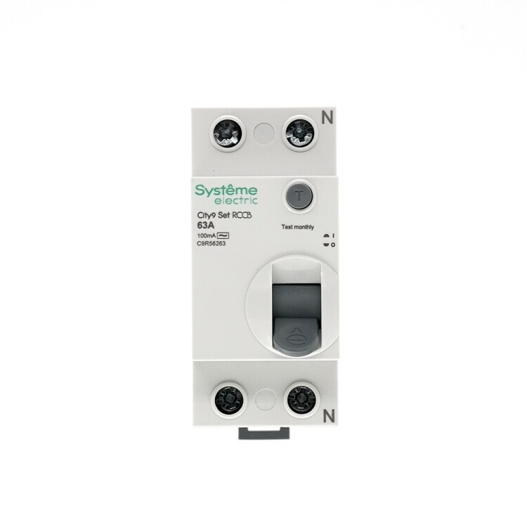 Выключатель дифференциального тока (ВДТ) или устройство защитного отключения (УЗО) серии City9 Set Systeme Electric, 2-полюсный, номинальный ток 63А, ток утечки 100 мА, тип АС, электромеханический. Применяется в электрических сетях напряжением 230В. Уставка по току утечки 100 мА обеспечивает гарантированную защиту людей при прямом и косвенном прикосновении. Кнопка тест обеспечивает проверку работоспособности аппарата. Крепление на DIN-рейку шириной 35 мм. Подключение сверху и снизу. Безопасные клеммы (ранее Schneider Electric Easy9 EZ9R54263).
