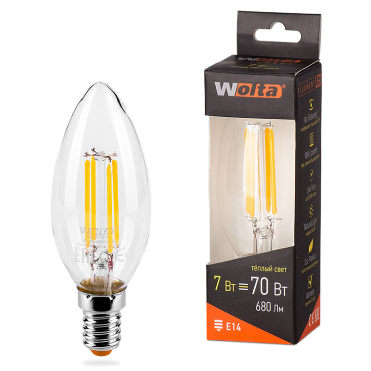 WOLTA Лампа FILAMENT LED C37 7Вт 730лм 3000К E14 1/10/50
