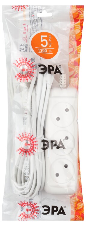 Бытовой удлинитель ЭРА UX-3-5m на 3 гнезда, отличается длинным проводом 5 метров ШВВП 2x0,75мм2. Рассчитан для подключения простых бытовых приборов стандартной мощности. Максимальная нагрузка - 6 A/ 1300 Вт. Базовый белый цвет, аккуратный дизайн с закруглёнными углами. Для комфорта и безопасности гнёзда слегка "утоплены" в корпус. Изготовлен из надёжного полипропилена со специальными антипиренами, препятствующими горению.