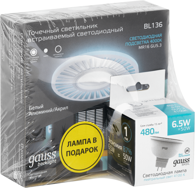 Набор Gauss Светильник Backlight BL136 3W + Лампа MR16 6,5W 480lm 4100K GU5.3 LED