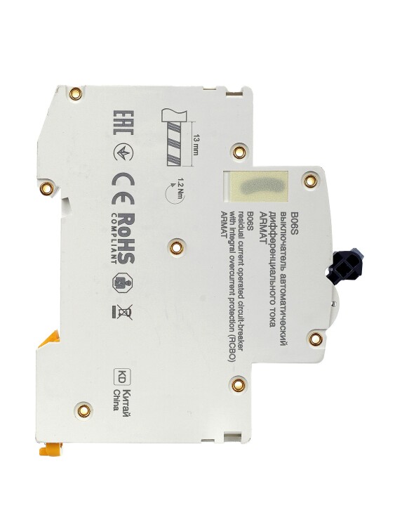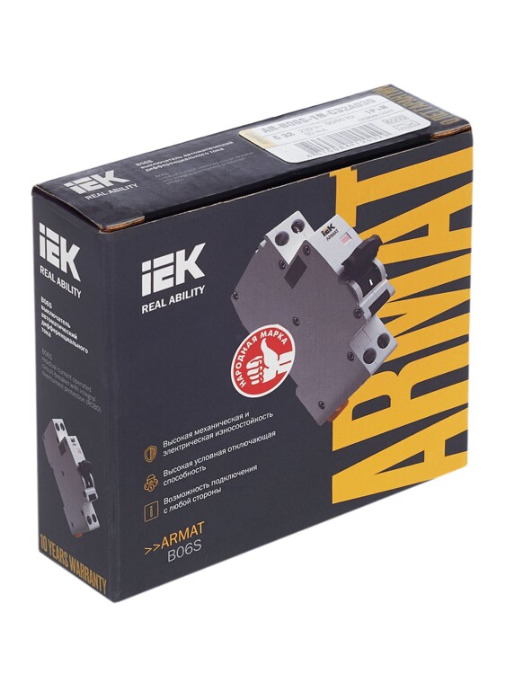 Автоматические выключатели дифференциального тока (АВДТ) ARMAT серии B06S могут осуществляют функции защиты от токов перегрузки и короткого замыкания и защиты человека от токов замыкания на землю. Модельный ряд включает в себя устройства с номинальными токами от 6 до 32 А, характеристиками срабатывания по сверхтоку B и C, типами защит AC и A с номинальным дифференциальным током отключения 30 мА. Номинальная отключающая способность АВДТ ARMAT серии B06S составляет 6 кА.