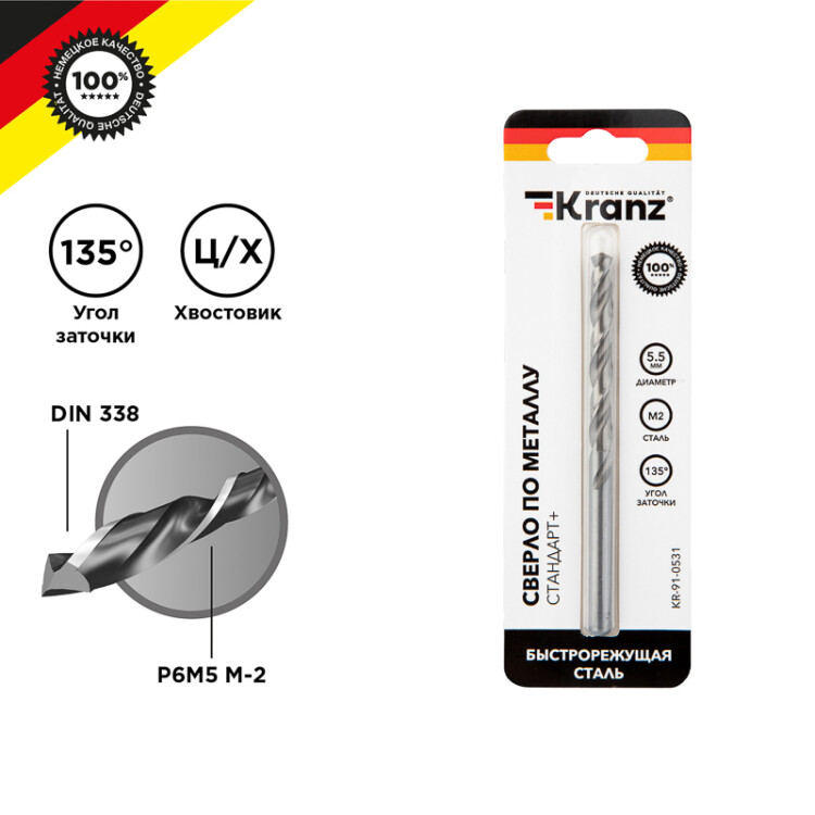 Сверло по металлу 5,5х93х57мм «Стандарт+» (P6M5 M-2) DIN 338, 1 шт. в блистере KRANZ (кр. 1 упак)