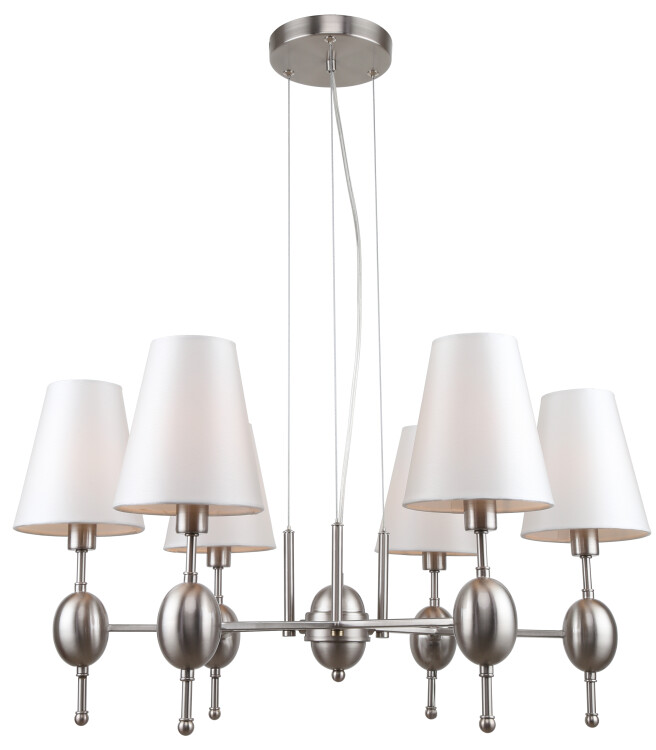 Данная люстра подвесная с 6 плафонами-абажурами освещает площадь 18 м2 и отлично подходит в качестве люстры в гостиную, люстры в спальню, люстры в загородный дом. Цвет люстры – модный никель сатин. Для стиля современная классика эта люстра на потолок – настоящая находка.
