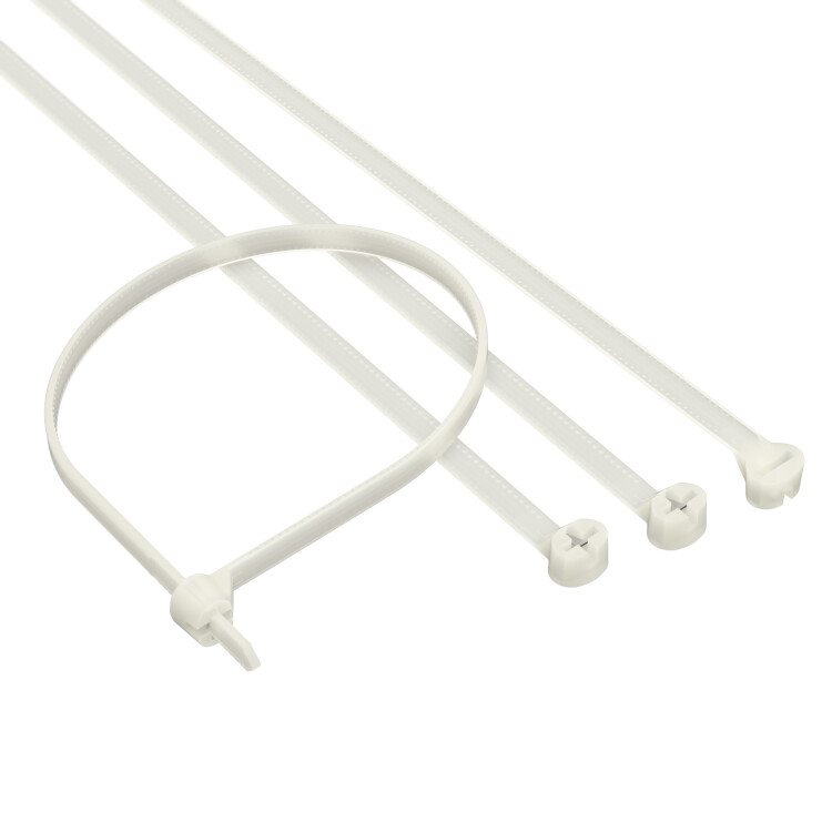 Кабельные хомуты с замком из нержавеющей стали предназначены для трассировки кабельно-проводниковых линий при выполнении электротехнических работ. Конструкция с фиксирующим «зубом» гарантирует долговечную фиксацию, а отсутствие ребер жесткости в сочетании с рельефной структурой внутренней поверхности ленты предотвращает проскальзывание и повышает надежность к репежа. Размеры: ширина – 4,8 мм, длина – 250 мм, цвет – белый.