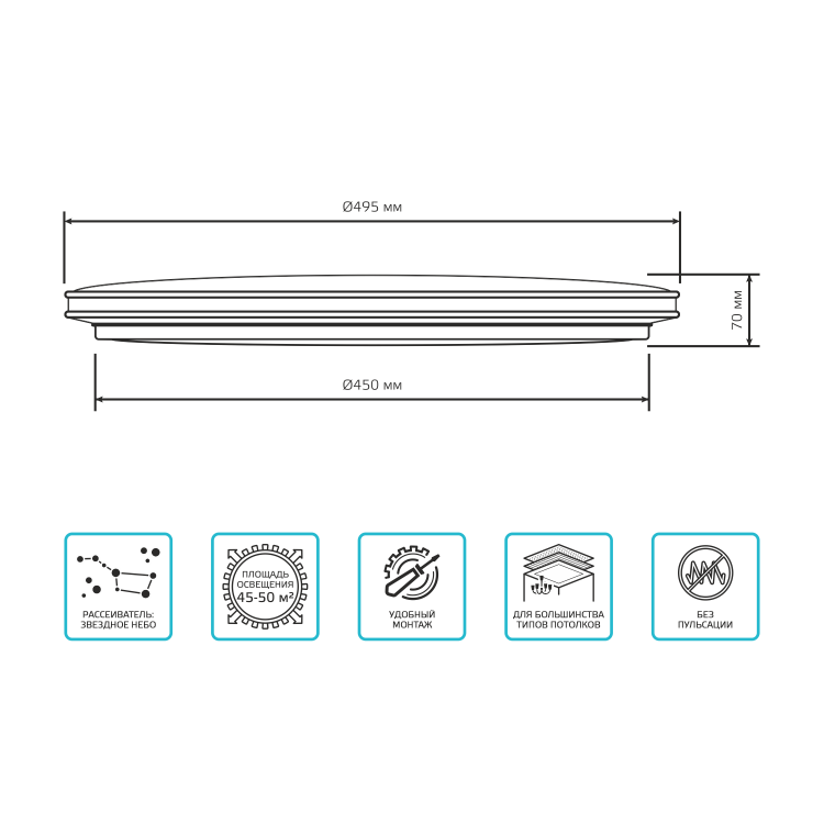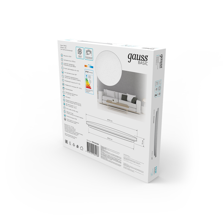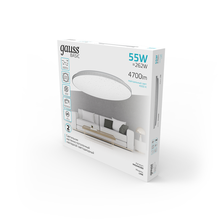 Светильник Gauss Basic Space Line (черта космоса) это овальный стильный и минималистичный светильник с рисунком Звездное небо, который проявляется во включенном режиме. Мощность лампы составляет 55w, чего достаточно для освещения площади помещения в 15-20м². Световой поток 4700лм, цветопередача 4000к. Пылезащита IP20 соответствует требованиям сухих жилых комнат, таких как гостинная, спальня, рабочий кабинет, кухня, коридор, прихожая, где этот светильник будет уместен, благодаря своему элегантному и лаконичному внешнему виду.