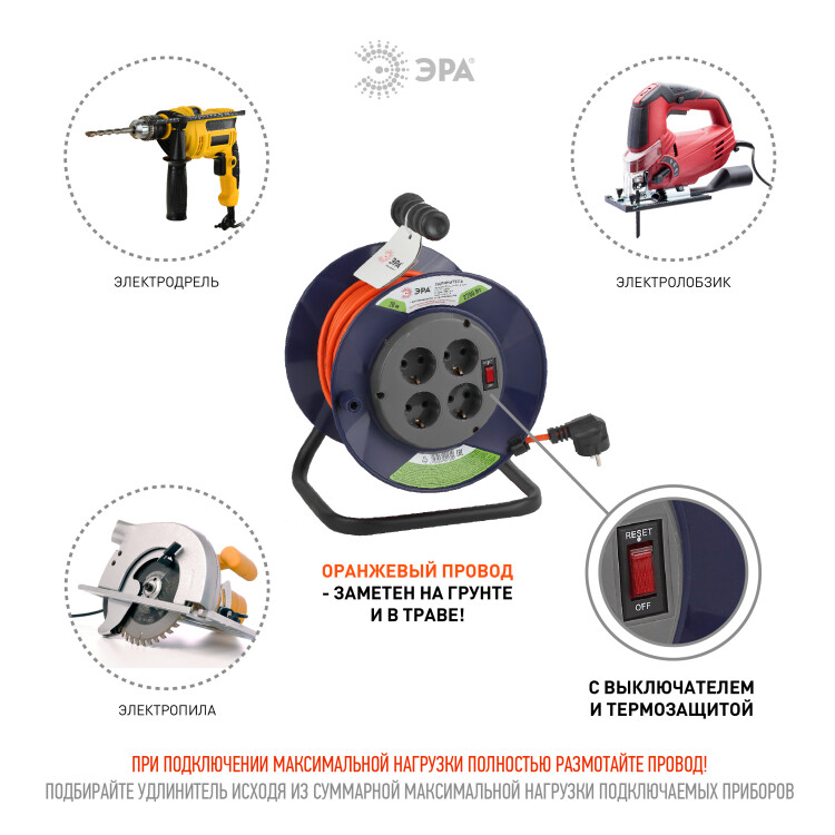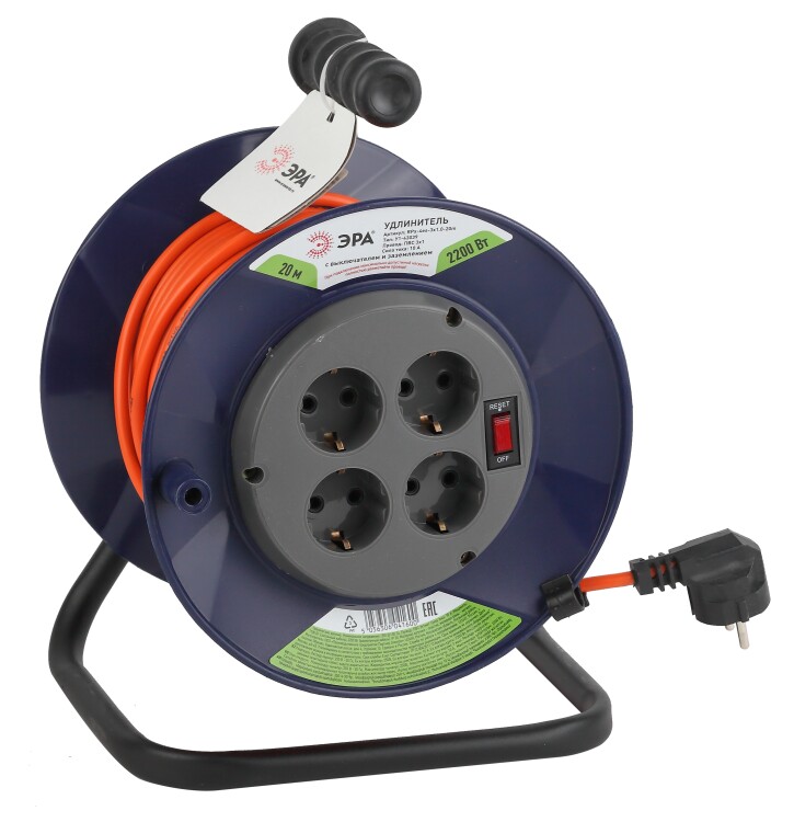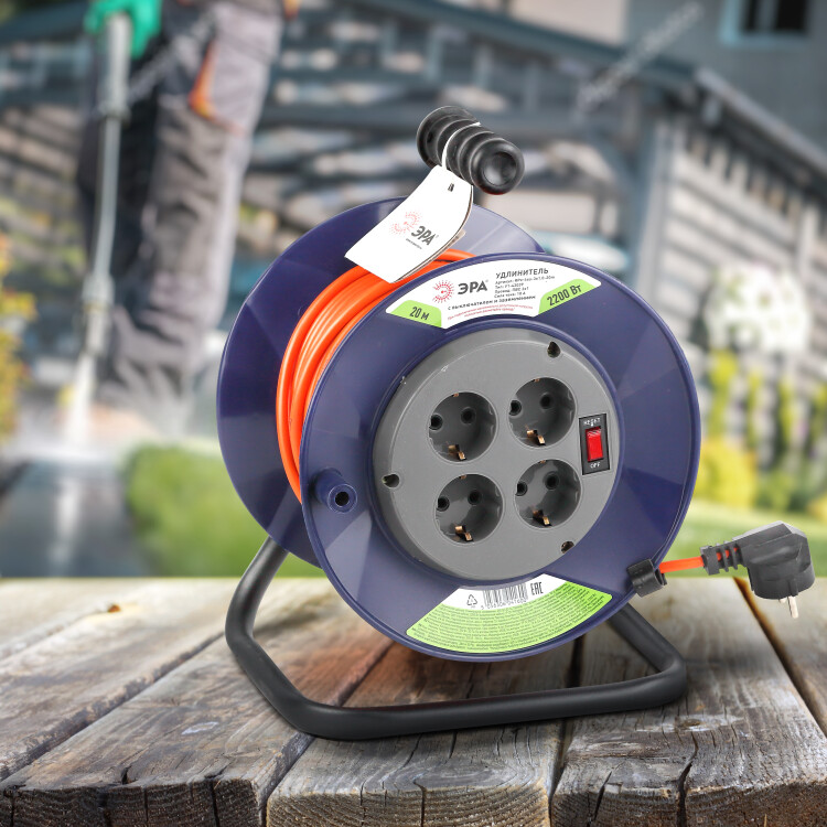 Удлинитель силовой на пластиковой катушке ЭРА RPx-4еs-3x1-20m с заземлением, с выключателем, ПВС 3x1м2, 4 розетки, 20м. Мощность 16А/3500Вт. Используется для работы на строительных площадках или дачных участках. Удобен при работе с приборами находящимися удаленно от стационарной розетки. Например, газонокосилки, электрические, пилы, триммеры или электродрели. Провод в удлинителях Эра сделан из 100% меди, что делает его абсолютно пожаробезопасным. Рама удлинителя сделана из высокопрочной стали а пластиковой корпус выполнен с применением негорючих добавок.