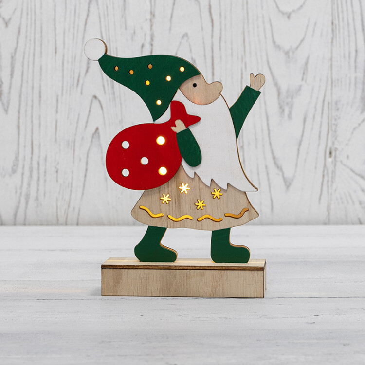 Деревянная фигурка с подсветкой "Дед Мороз" высотой 18 см работает от двуx батареек типа ААА, поэтому ее можно разместить в любом уголке вашего дома, не уделяя внимание поиску розеток. Изделие, произведенное из экологичныx материалов, станет прекрасным подарком к новогодним праздникам, который вызовет только приятные эмоции. 5 экономичныx диодов теплого белого свечения мягко обрамляют композицию, создавая атмосферу тепла и уюта. Фигурка предназначена для использования в помещенияx с умеренной влажностью.