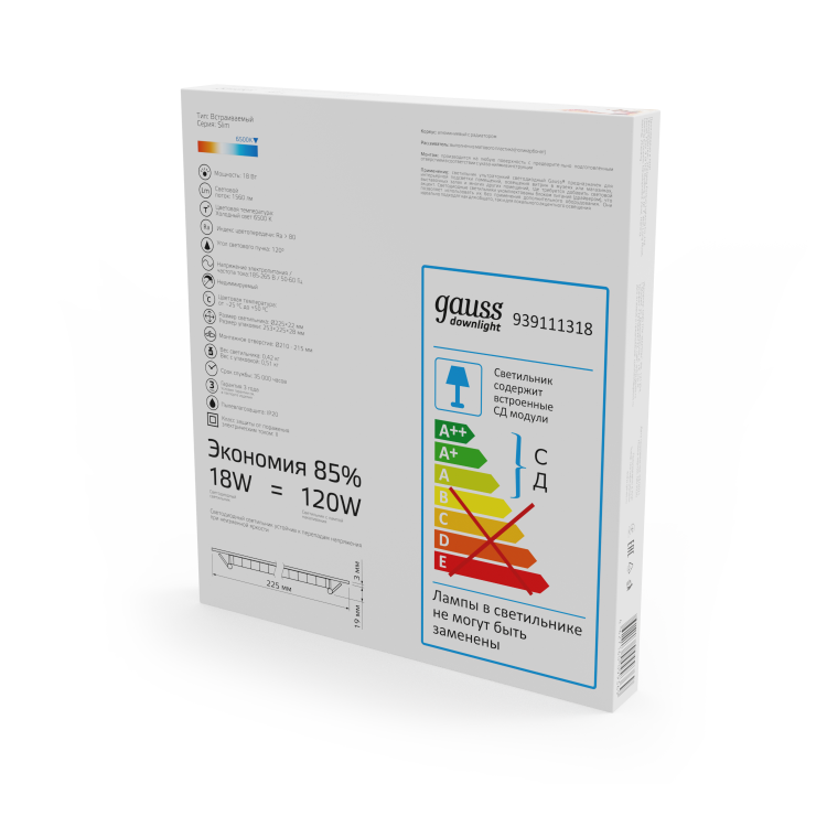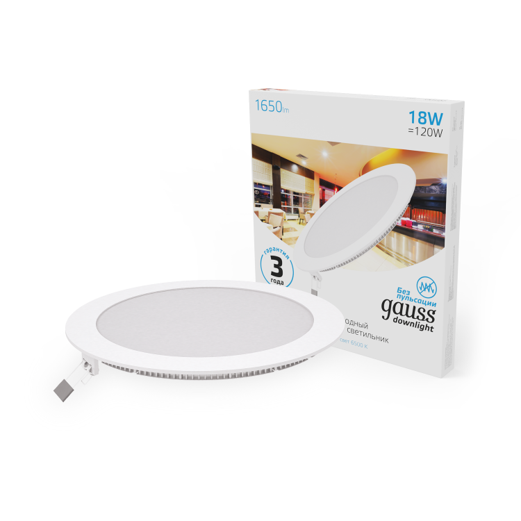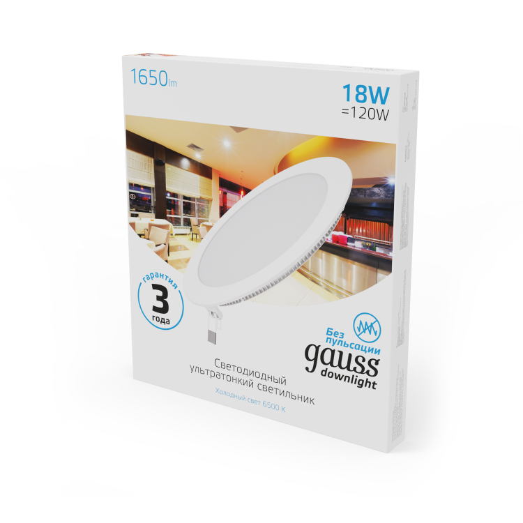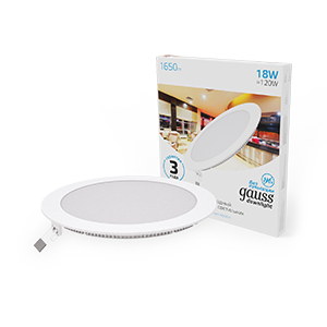 Светильник ультратонкий встраиваемый Gauss Slim Downlight круг 18w (соответствует лампе накаливания 120w), со встроенными СД модулями и корпусом 2.2см - это прекрасное решение для интерьера с плоскостными световыми элементами на невысоком потолке. Светильник может использоваться в любой комнате с пылезащитой не превышающей IP20, а так же в офисах предприятий и учреждений. Благодаря качественным составляющим, он спокойно переносит перепады в сети не изменяя яркость; работает без вредной для глаз пульсации. Цветовая температура - 6500К (холодный белый свет).
