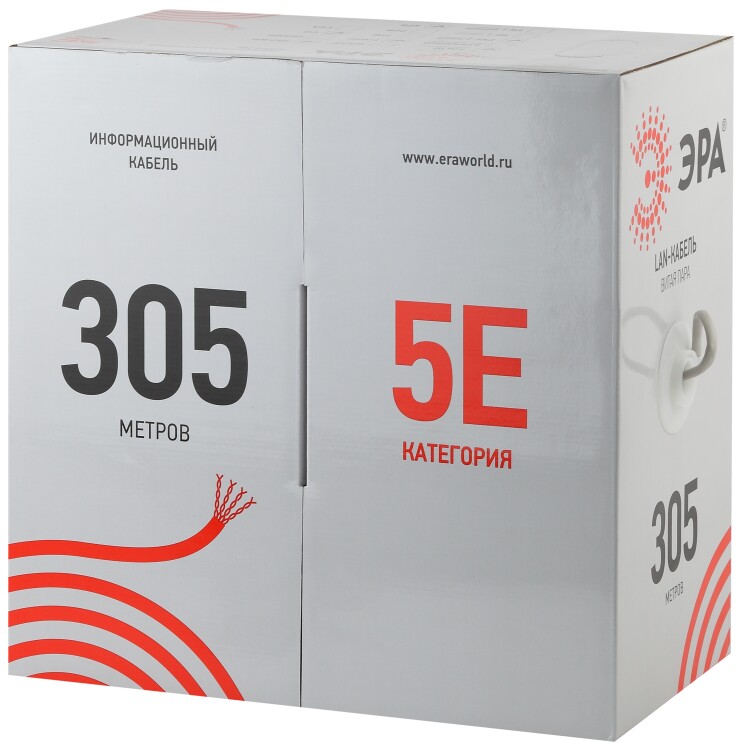 Кабель U/UTP 4x2x24 AWG Cat5e CU PE 305м ЭРА применяется для построения компьютерных и информационных сетей, систем охраны, телефонии, центров обработки данных, цифрового телевидения и видеонаблюдения (в том числе с PoE+), внутри и вне помещений, устойчив к ультрафиолетовым лучам.