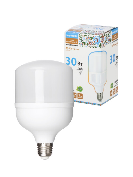 Лампа светодиодная T-30 Вт-230 В-6500 К–E27 (99x168 мм) НАРОДНАЯ (кр.1шт)