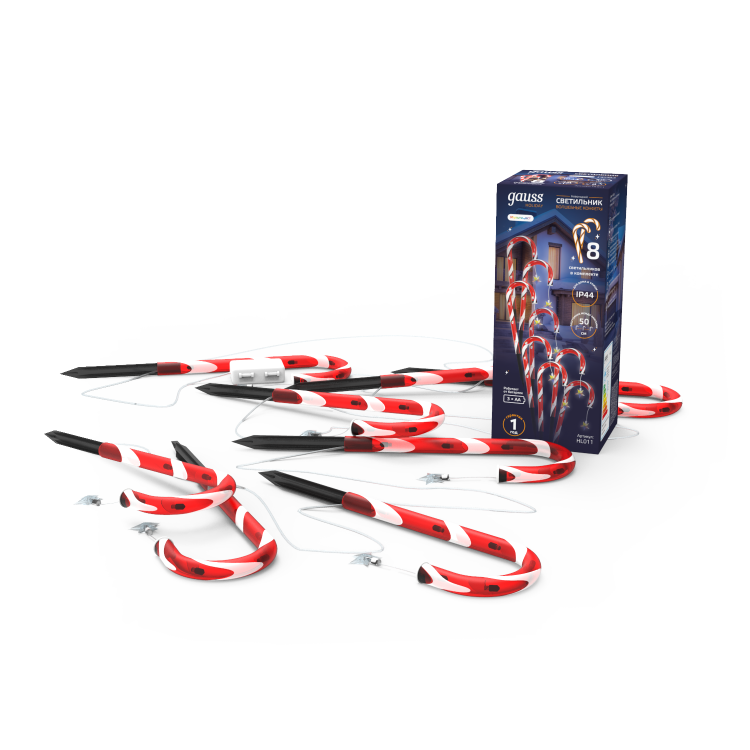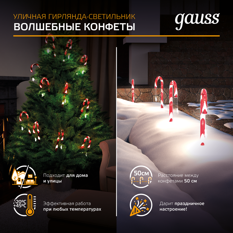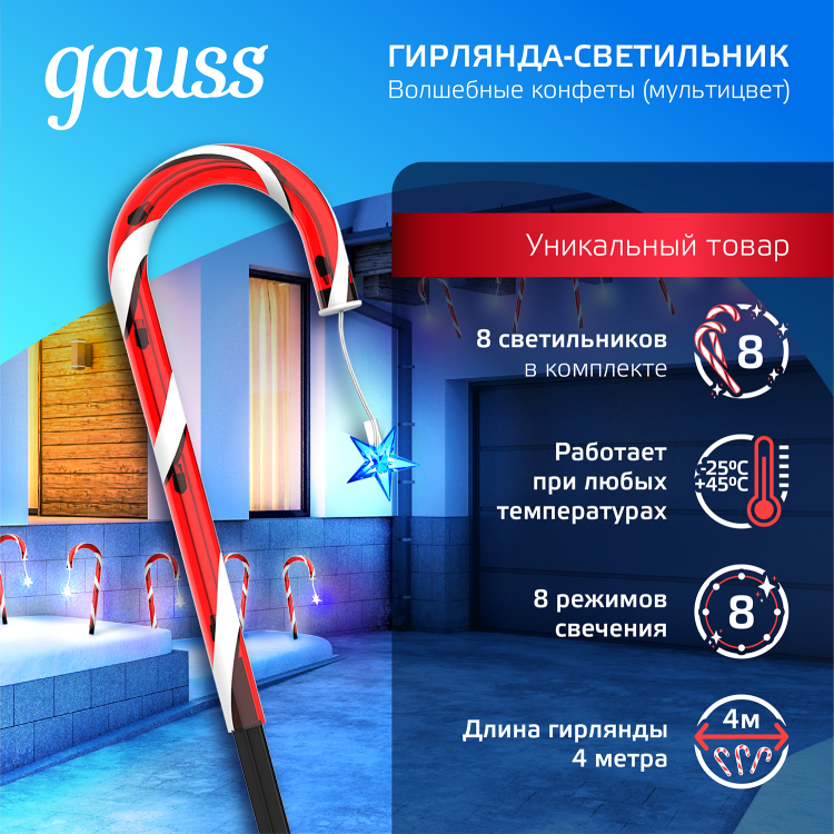 Светильник новогодний Gauss Holiday "Волшебные конфеты" мультицвет HL011 это уличная 4м гирлянда-светильник с 8 режимами работы. Он предназначен для дома и улицы, имеет надежную защиту от снега и дождя IP44 и может быть использован не только в новогодней тематике, но так же для создания атмосферы праздника в день рождения, на вечеринке и просто для подсветки садовых объектов на даче. У него широкий диапазон максимальных температур от -20 до +45 и длительный период работы от 3 АА батареек. Для фиксации в почве или в снегу используются специальные колышки.
