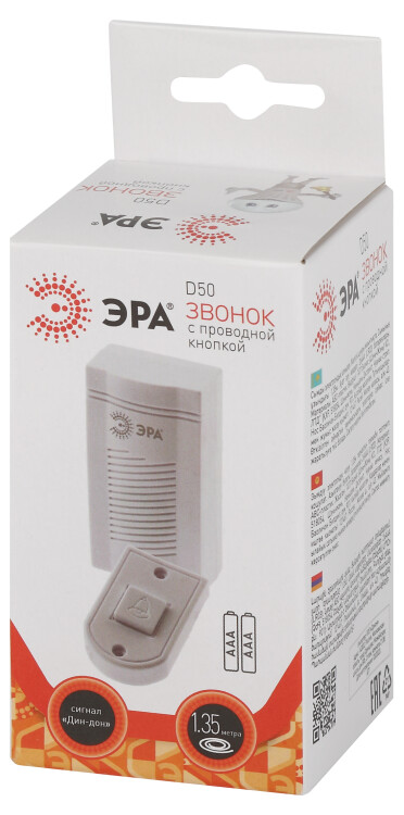 ЭРА D50 - проводной электрозвонок с полифонической мелодией. Динамик работает от 2 мизинчиковых батареек (2 х ААА) и отличается оптимальной громкостью. Длина провода, соединяющего кнопку и динамик - 1,35 м. Корпус изготовлен из легкого прочного пластика базового белого цвета. Электрозвонок ЭРА универсален для любого интерьера. Прост в установке и удобен в использовании.