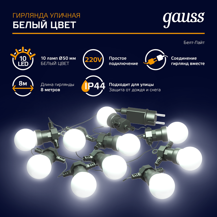 Гирлянда светодиодная Белт Лайт Gauss - идеальный способ создать волшебную атмосферу во время праздников или уютно подсветить сад или балкон. 10 ярких белых ламп, превратят ваше пространство в настоящую сказку. Гирлянда обладает рядом преимуществ, что делает её лучшей среди аналогов: