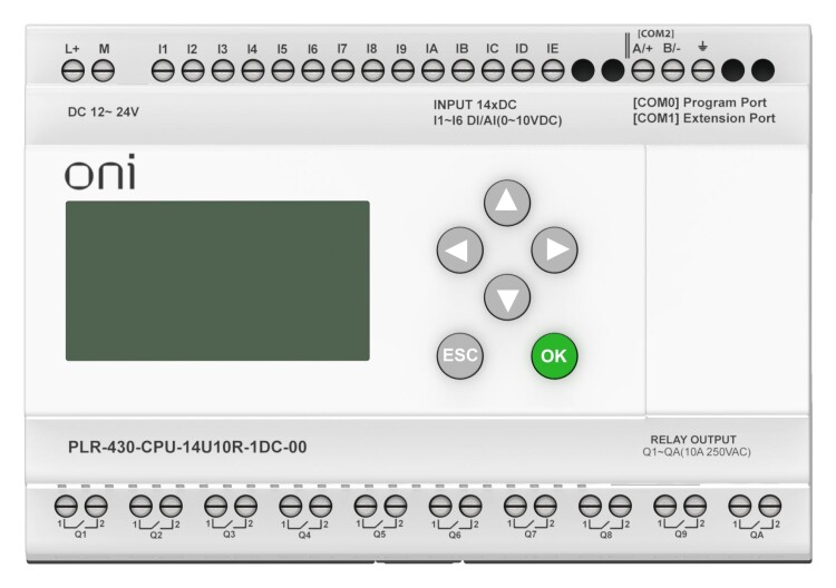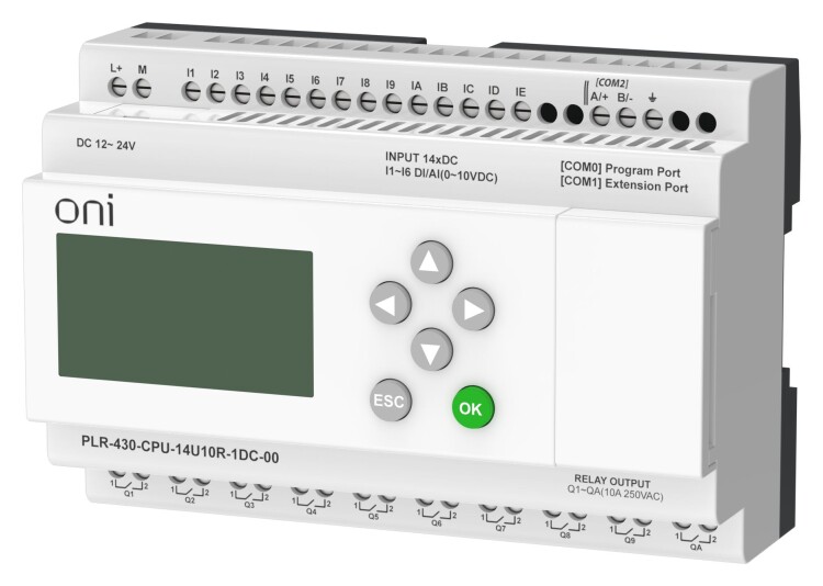 Модуль ЦПУ ПЛК 430 ONI с возможностью расширения количества каналов ввода-вывода и коммуникаций с помощью модулей расширения. С интегрированным полнофункциональным экраном. 14 дискретных входов, 6 из которых можно использовать как аналоговые 0..10В и 4 как высокоскоростные счетчики до 60кГц, и 10 релейных выходов. Интегрированы 1 интерфейс RS485 и 1 интерфейс RS232. Напряжение питания 24 В DC.