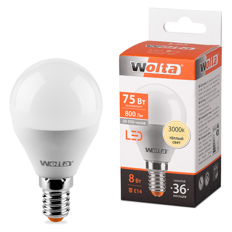 Лампа LED WOLTA G45 8Вт 800лм Е14 3000К 1/50 (кр.50шт)