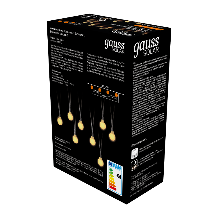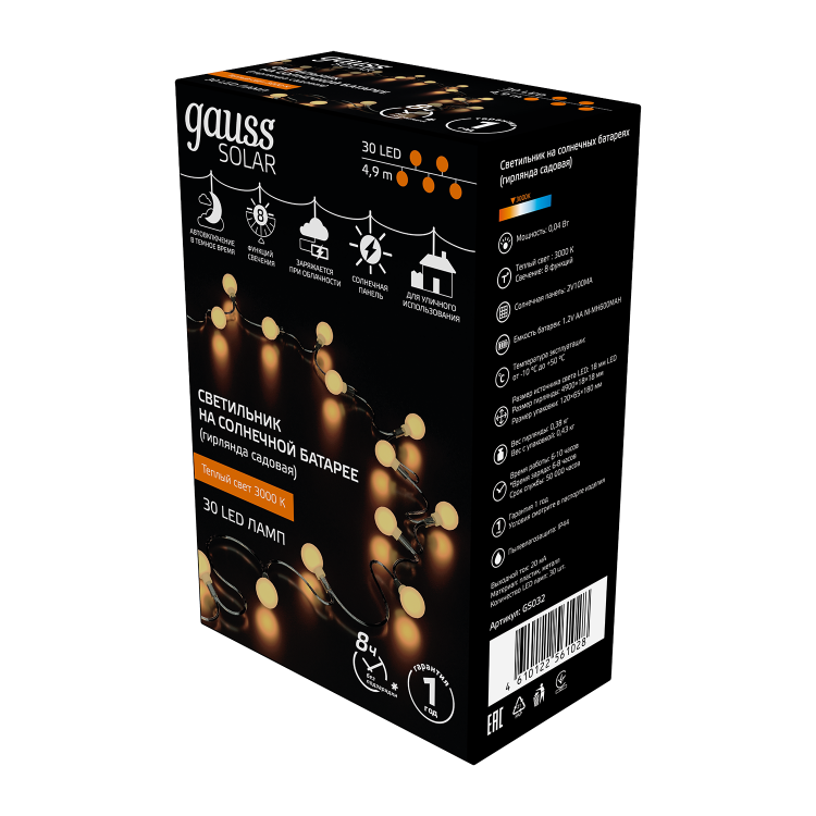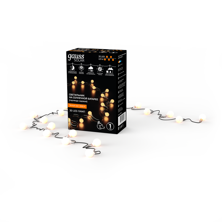 Гирлянда Gauss Solar с 30 LED лампами в форме шаров позволит создать атмосферу уюта и волшебства вечером. Почему стоит выбрать именно гирлянду Gauss Solar. Гирлянду можно разместить вокруг дома, между деревьями, опоясать ею беседку или протянуть вдоль дорожек в саду. 30 больших шаров, работающих от солнечной панели, будут светить 8 часов, не требуя затрат на электричество. Солнечная панель будет подзаряжаться днем даже в пасмурную погоду, чтобы вечером ваша гирлянда засияла всеми 30 огнями.