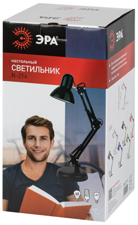 Настольный светильник ЭРА N-214-E27-40W-P классического дизайна может использоваться с разными источниками света - лампой накаливания, компактной люминесцентной лампой (КЛЛ) или светодиодной (LED) лампой. Выключатель на проводе. Устойчивое основание. Высота плафона регулируется двухсекционной сгибающейся стойкой, направление света - поворотом и наклоном плафона в любом направлении.